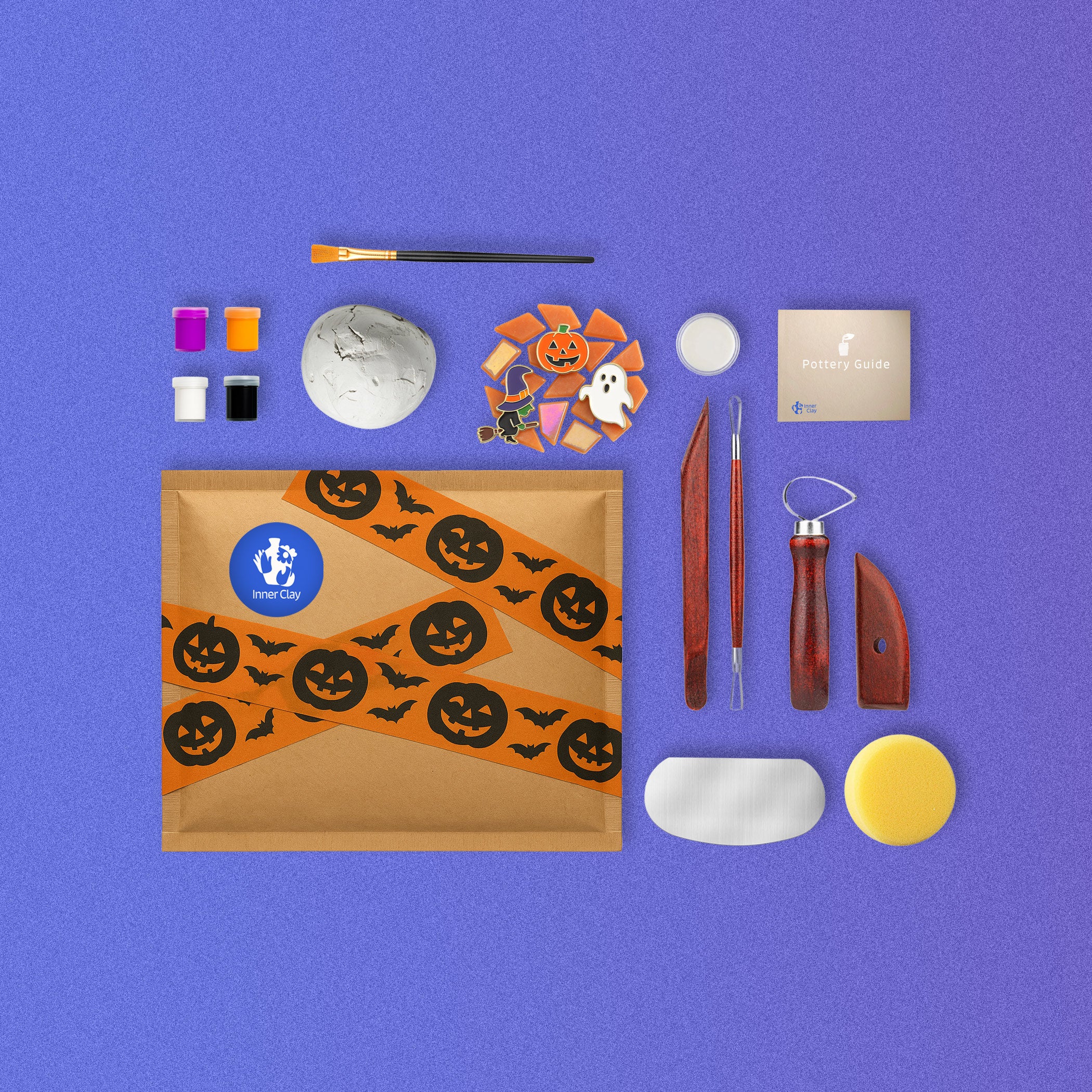 Inside the kit, youâll find soft air-dry clay, easy-to-use pottery tools, and Halloween-themed paints with a brush to bring your creations to life. To make your pieces even more festive, weâve included a mix of mosaic tiles and 3 surprise enamel pins with fun Halloween designs. A final coat of varnish will protect your pottery so you can display your handmade decorations all season long.